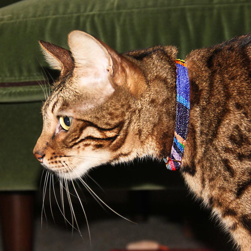 Our cat collars are handcrafted with lightweight yet durable coated canvas, finished with our signature gold bell & safety release buckle. The result is a luxurious cat collar that is super comfortable to wear yet tough enough to keep up with the demands of an active cat. You may notice your cat strutting in this collar but your cat won't. They'll barely notice it's there!